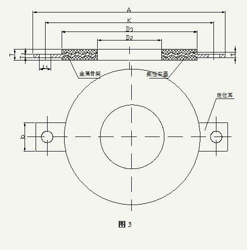 帶定位耳型柔性石墨金屬波齒復(fù)合墊片適用于全平面和突面法蘭,其結(jié)構(gòu)型式應(yīng)符合圖3的規(guī)定。